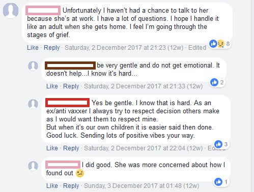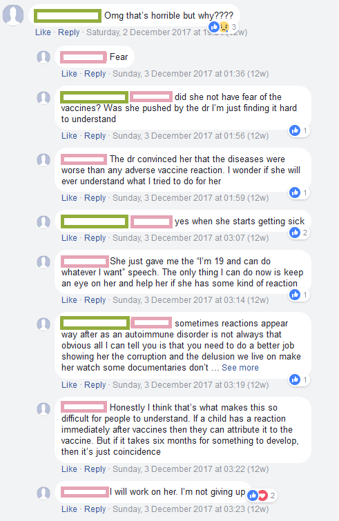 Il medico ha convinto la ragazza che le malattie per cui si è vaccinata sono molto peggio degli effetti avversi dei vaccini. “Mi chiedo se capirà mai quello che ho cercato di fare per lei“. Giusto, del resto le mamme “informate” ne sanno più dei medici. La mamma no-vax, poi, ammette di essere preoccupata dalle possibili reazioni avverse dei vaccini e dice che controllerà la figlia. Un commentatore sollecita la mamma a fare di più, mostrandole la corruzione che c’è dietro ai vaccini e mostrandole documentari., ecc. La mamma promette di non arrendersi.