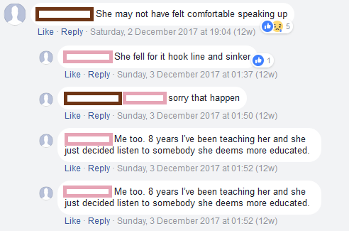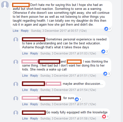 Infine il commento òiù sconcertante: c’è chi augura alla ragazza di avere una reazione avversa da vaccino, qualcosa che “le serva da lezione”. Altrimenti continuerà a “farsi avvelenare”! !Alle volte serve l’esperienza personale per capire e può essere la migliore educazione. La vergogna inoltre è quello che serve”. Afferma qualcun altro. La mamma-no vax è d’accordo nel dare una lezione alla figlia: dice di sentirsi male, ma allo steso tempo non vuole che sua figlia “faccia questo” ai suoi figli in futuro. “Ha bisogno di una svegliata”.
