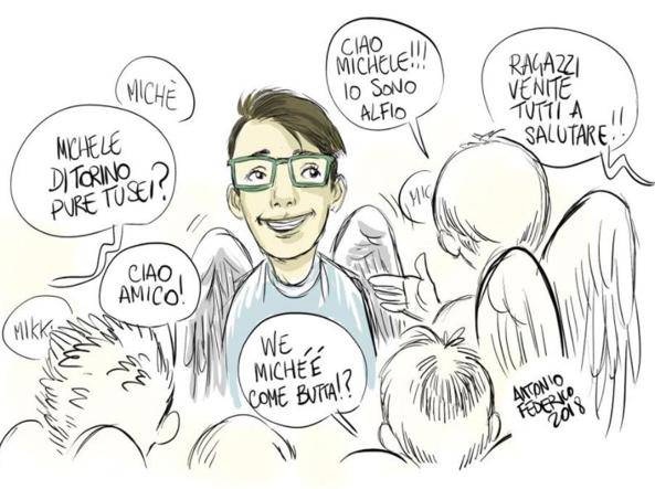 L’artista Antonio Federico ha deciso invece di ricordare Michele con una vignetta che lo ritrae insieme a tanti angeli gentili che lo circondano e lo accolgono.