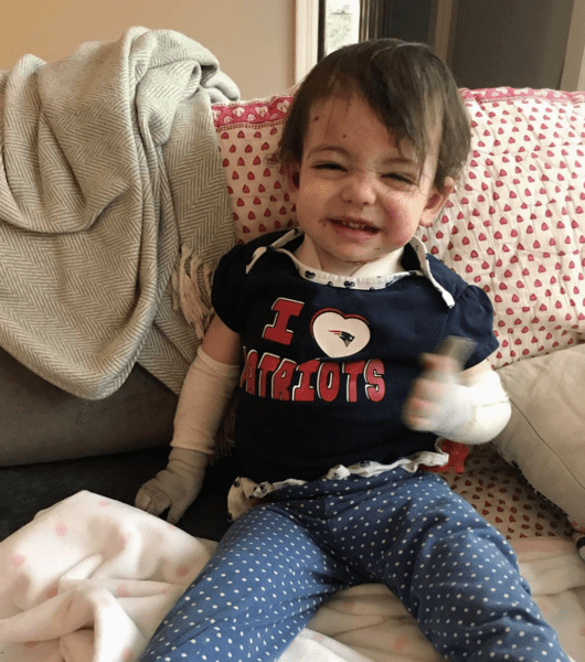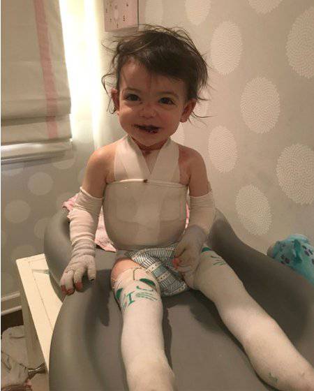 Elodie ora ha 20 mesi e deve indossare delle fasciatore sul petto, sulle mani, sui piedi, notte e giorno per evitare di danneggiare la pelle.