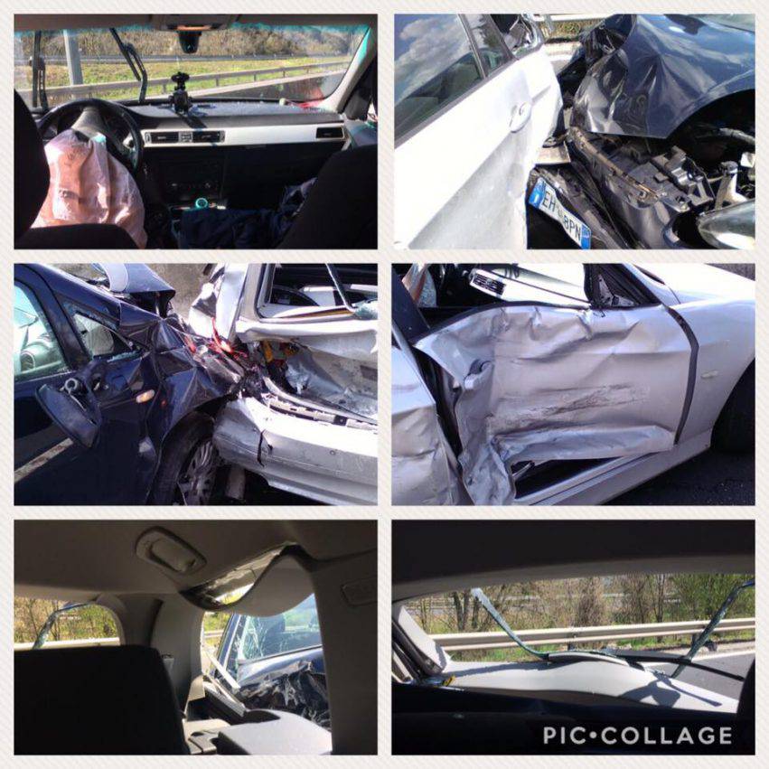 Svolgimento: Cassia bis, stavamo andando a pranzo da mia zia..Iniziavamo a rallentare perché c’era fila quando dietro la curva alle nostre spalle arriva uno a manetta che ci ha preso in pieno. Il mio compagno ha cercato di tenere la macchina il più possibile e di non entrare dentro la macchina che avevamo davanti (con altri due bambini), quindi ha sterzato finché ci siamo schiantati contro il guardrail di cemento, prendendo comunque poi anche la macchina davanti. Al mio compagno davanti è scoppiato l’airbag, io ero dietro (con la cinta) con nostra figlia di tre anni e mezzo che (per fortuna) dormiva. Per fortuna, perché così aveva gli occhi chiusi ed io ero terrorizzata dalla pioggia di vetri negli occhi; per fortuna perché non ha vissuto tutta la scena, anche se ovviamente si è svegliata piangendo per il botto spaventatissima. Macchina distrutta, da buttare e noi illesi (qualche ficozzo io, qualche graffio il mio compagno, un po’ doloranti ma va bene così. la bambina completamente illesa).