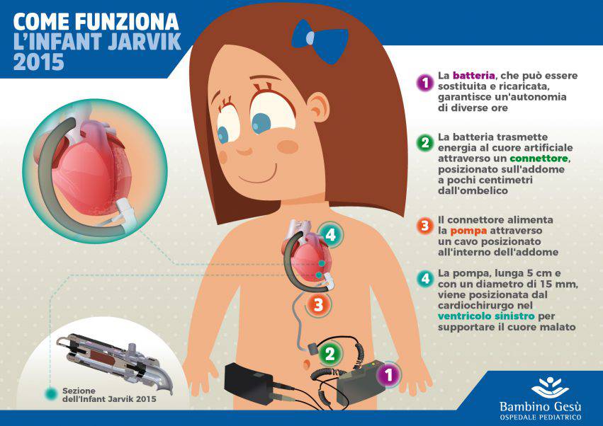 ll vantaggio di questo dispositivo è appunto quello di evitare l’ospedalizzazione per i pazienti. “Il National Heart Lung and Blood Institute ha iniziato il programma PumpKIN nel 2004 per finanziare lo sviluppo e la valutazione clinica del Jarvik 20015 Vad e di altri dispositivi simili, poiché i bambini con insufficienza cardiaca avevano a quei tempi un numero davvero ridotto di opzioni che gli consentisse di rimanere in vita. Questo – ha detto Timothy Baldwin, responsabile Nhlbi del progetto PumpKIN – è vero ancora oggi. Tenendo conto di tutti gli sforzi fatti per arrivare fino a questo punto, l’apparente successo del primo impianto effettuato presso il Bambino Gesù è per noi molto gratificante”.