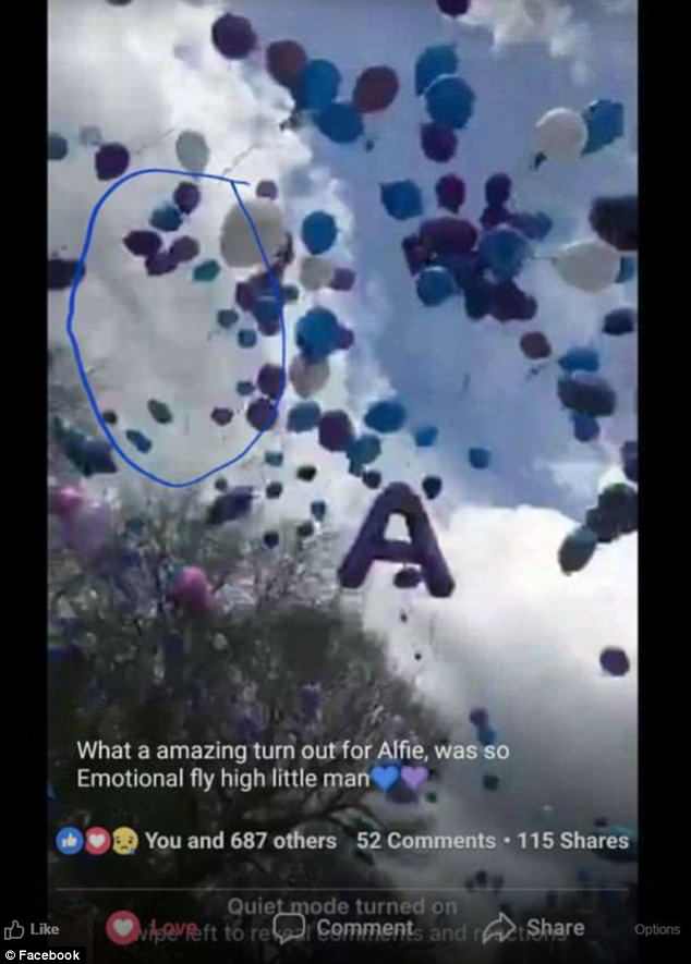 I palloncini viola e azzurri sono stati fatti volare davanti all’ospedale Alder Hey e alcuni manifestanti hanno affermato di aver visto il viso di Alfie, disegnato dalle nuvole, tra i palloncini. Le foto sono state pubblicate sui social e sui media inglesi