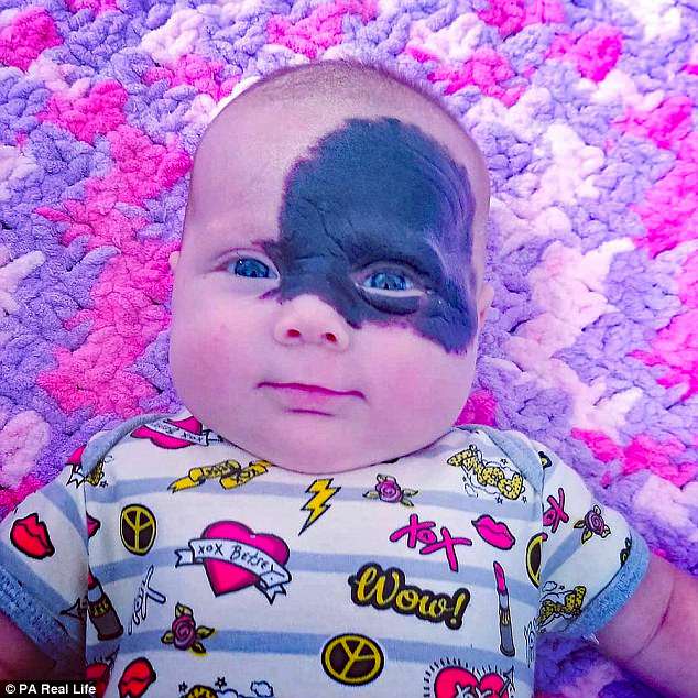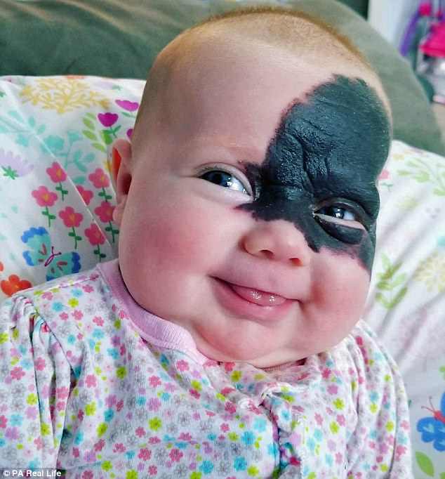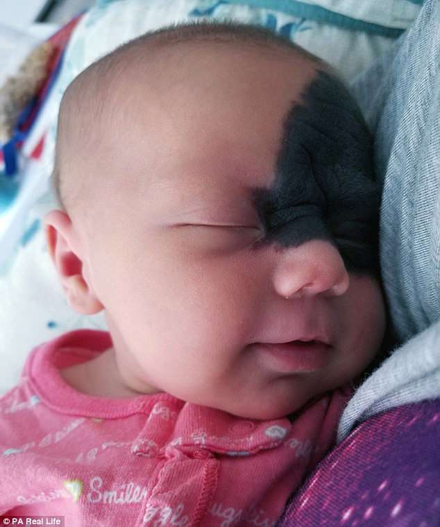 Una bimba nata con una voglia scura sulla faccia è un supereroe