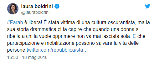 Infine anche l’ex ministro Laura Boldrini ha gioito per la liberazione, scrivendo un Tweet su come la mobilitazione possa salvare delle persone.