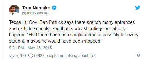 Infine ha destato scalpore la proposta del governatore del Texas Dan Patrick che ha attribuito la causa della nuova strage alla presenza di troppe entrate ed uscite a scuola. Secondo lui con una sola entrata l’attentatore sarebbe stato fermato con più facilità.