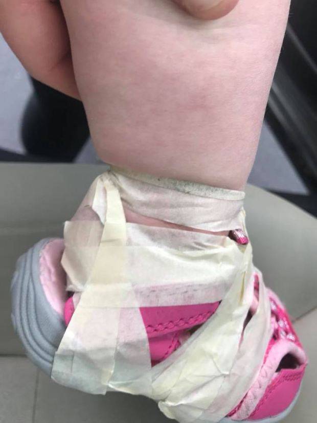 “Qualcuno ha qualche problema con questo o sono io l’unica?” ha scritto la mamma mostrando le scarpine attaccate con il nastro adesivo e i risultati, ovvero i segni lasciati dalla nastro, le caviglie gonfie e arrossate della piccina.