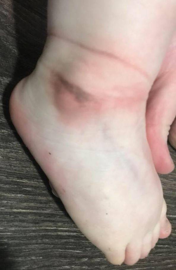 La donna ha condiviso su Facebook le immagini dei segni lasciati dal nastro sulle caviglie della piccola.