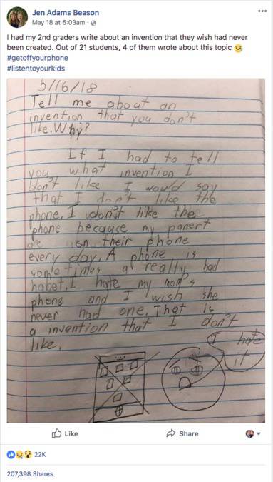 “In classe abbiamo discusso su Facebook e ogni singolo alunno ha ammesso che ogni genitore trascorre più tempo su Facebook che ascoltando e parlando con i figli. Questo mi ha aperto gli occhi. Ascoltate i vostri bambini e lasciate i cellulari”.