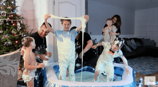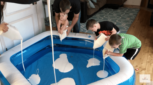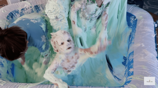 “Abbiamo riempito una vasca gonfiabile da bambini nel salotto, scaricato tutti gli ingredienti nella piscina e usato i nostri corpi (pannolini e tutto) per mischiare lo slime”.
