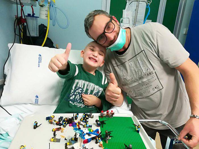 Il bambino ritratto nella foto in alto con il papà si chiama Alessandro e abita a Senigallia, in provincia di Ancona. Da diversi mesi lotta contro una grave forma di leucemia e da alcune settimane è ricoverato all’Ospedale Bambino Gesù di Roma, per sottoporsi al trapianto di midollo osseo.