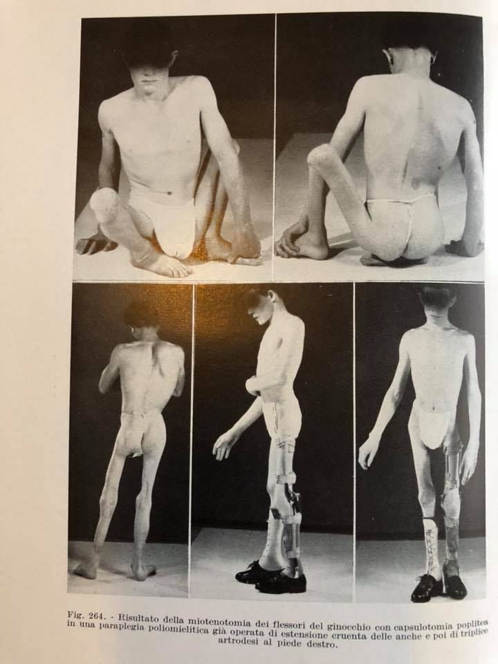 Quando la polio era la polio, si curavano le deformità, non la paralisi: per quella non c’era, e non c’è neanche oggi cura: i più fortunati sviluppavano paralisi localizzate a qualche muscolo, magari un piede, altri una gamba, o un braccio, chi, entrambe le gambe. Gli arti paralizzati rimanevano piccoli, e le articolazioni si deformavano“.