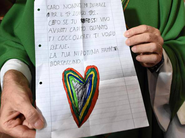 La letterina, scritta su un foglio a righe con un grande cuore colorato, è stata letta da Don Cosimo Scordato alla messa in memoria di Borsellino a cui erano presenti i figli del magistrato: Lucia, Manfredi e Fiammetta.