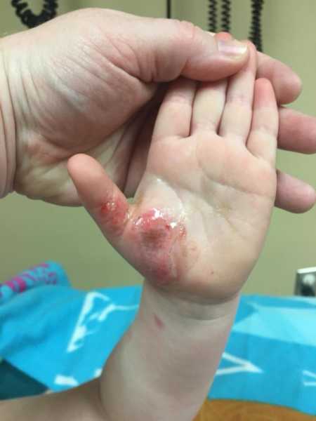 Tremavo mentre la pulivo per vedere. Ho iniziato a piangere perché si era fatta veramente molto male. Da mamma riconosci la differenza tra un pianto da turbamento e uno da dolore e questo era davvero uno di dolore. Ho avvolto la sua mano con uno straccio freddo e ho chiamato mio papà per avere un po’ di ibuprofene e cose per pulirla.