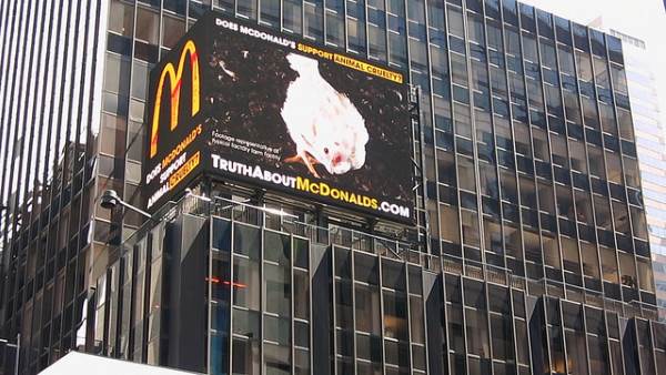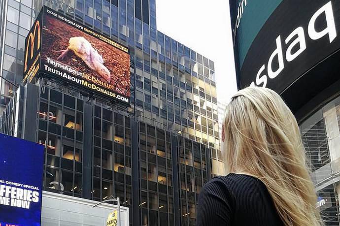 Fini al 31 ottobre la piazza più famosa di New York, Times Square, è teatro di una pubblicità shock sugli allevamenti che forniscono carne di poll a McDonald’s.