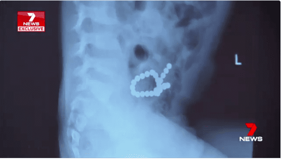 Successivamente le lastre hanno dimostrato che il piccolo aveva ingoiato 30 magneti mentre si trovava sotto la custodia della nonna e questi avevano viaggiato nel suo stomaco per unirsi.