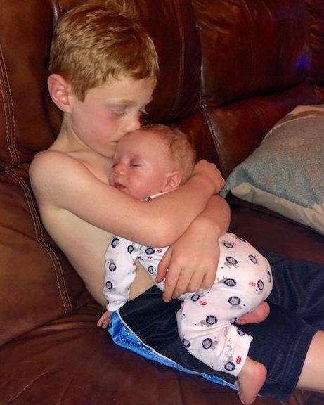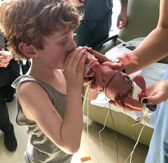 Un bambino di 6 anni abbraccia pelle a pelle il fratellino neonato prematuro.