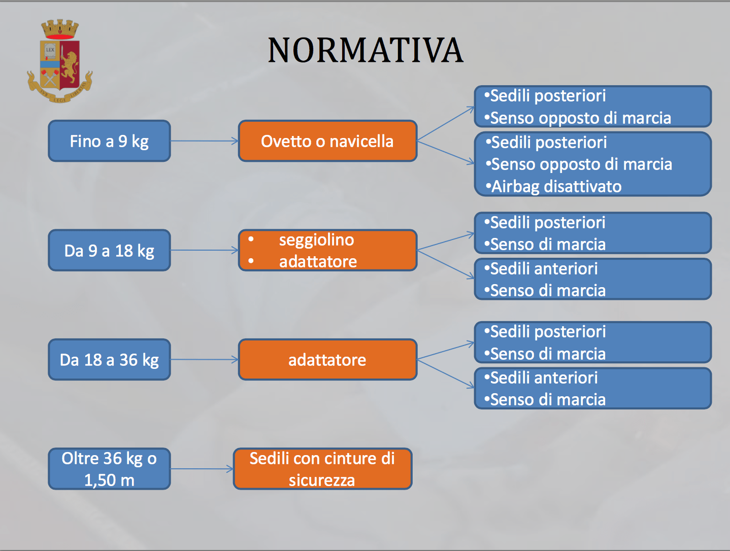 L’articolo 172 del codice stradale prevede l’obbligo del seggiolino omologato e adeguato al peso dei bambini fino a 1,50 m. di altezza.