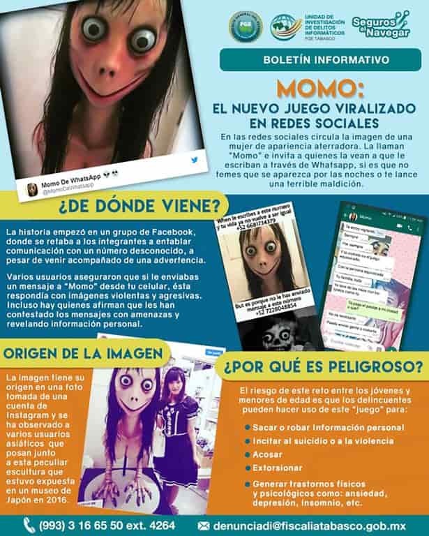 Tutto è iniziato in un gruppo su Facebook dove i membri sono chiamati a stabilire la comunicazione tra loro attraverso un numero sconosciuto”, ha scritto su Twitter l’unità Crime di Ricerca Web del procuratore generale dello Stato di Tabasco, in Messico. “Diversi utenti hanno detto che se invii un messaggio a ‘Momo’ dal tuo telefono cellulare, lui risponde con immagini violente e aggressive, e ci sono anche quelli che dicono di aver ricevuto minacce e di aver visto pubblicate informazioni personali”.