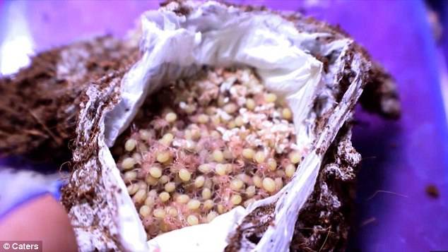 Nel video si vede che Marita usa forbici e pinzette per aprire la grande sacca nella quale ci sono ben 1460 piccole tarantole.
