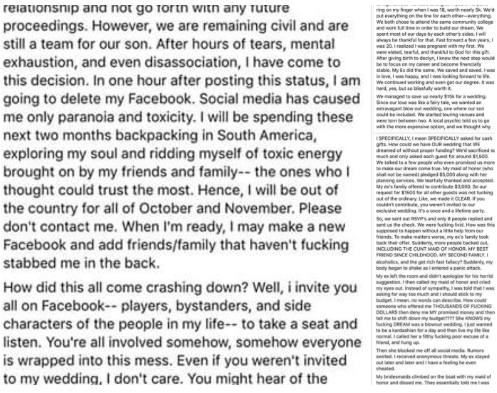 ll post inizia con la futura sposa che si lamenta per il fatto che non si sposerà più e che esprime la volontà di fare le valigie e di andare in Sud America per trovare sé stessa. E’ lei stessa qualche riga sotto a parlare del motivo per cui vuole lasciare gli Stati Uniti: lei e il fidanzato avevano 15mila dollari per il matrimonio, ma “Dal momento che il nostro amore era come una fiaba, volevamo delle nozze stravaganti”, che si traduce nei 60mila dollari per andare ad Aruba.