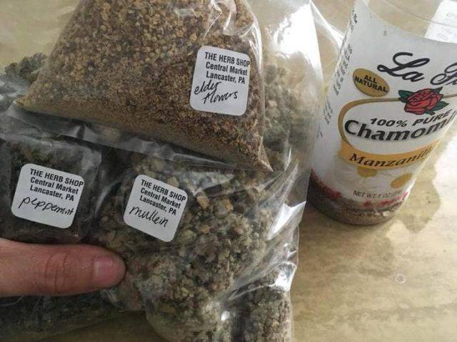 La donna ha mischiato meno di una manciata di foglie di menta, fiori per speziare, fiori di sambuco e camomilla.