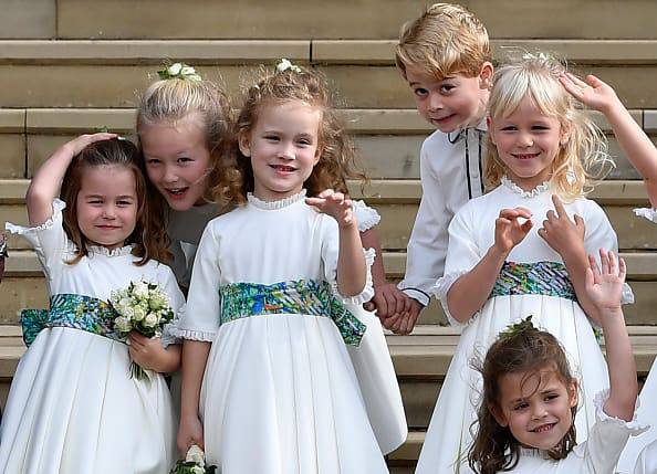 A seguirla nell’ingresso nella Cappella di San Giorgio, un lunghissimo corteo di damigelle e paggetti: oltre a Charlotte e a George, e alle cuginette Savannah e Isla Philips (figlie di Peter, figlio della principessa Anna), e a Mia Tindall (figlia di Zara, altra figlia della principessa Anna), ci sono anche Theodora Williams (figlia del cantante Robbie Williams), Louis De Givenchy (figlio di un banchiere francese) e Maud Windsor (figlia del cugino della Regina Elisabetta).