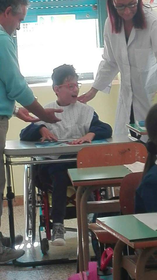 Francesco non può mangiar da solo, ha una paralisi cerebrale infantile, quindi ci vuole una persona che lo imbocchi….lo scorso anno dopo varie lotte è arrivata un OSS.