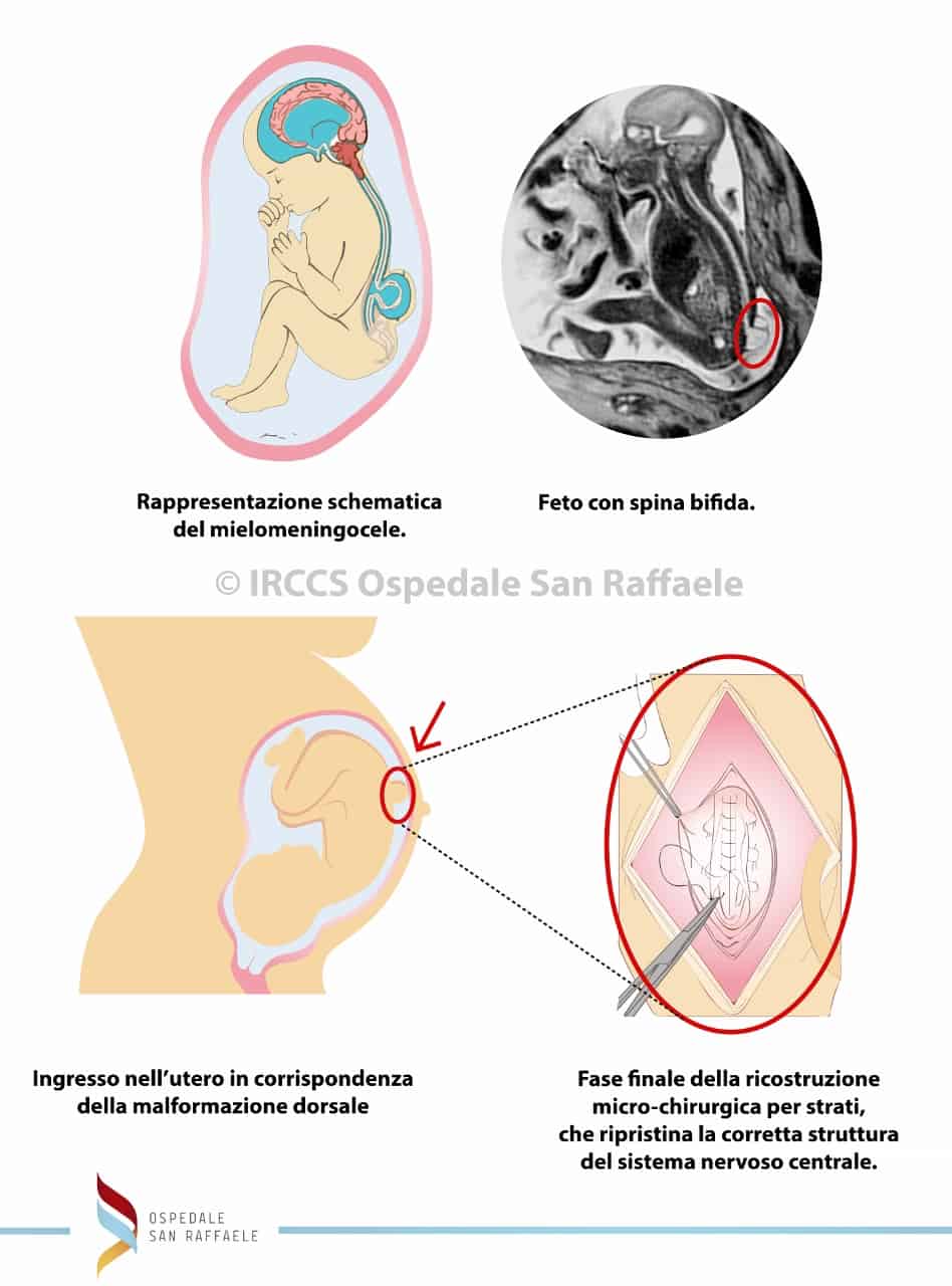 La bella notizia è che un’equipe dell’IRCCS Ospedale San Raffaele di Milano ha realizzato con successo un intervento di ricostruzione completa fetale in utero. L’equipe multidisciplinare, composta da ostetrici-ginecologi, neurochirurghi, anestesisti, infermieri e ostetriche specializzati, ha utilizzato una tecnica per riparare in modo definitivo il difetto congenito mai utilizzata prima in Europa: si tratta di un approccio che ha un impatto minimo a livello uterino e quindi rischi minori per madre e feto.