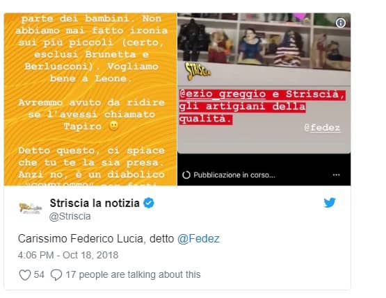 “Carissimo Federico Lucia, detto Fedez, siamo sempre stati dalla parte dei bambini. Non abbiamo mai fatto ironia sui più piccoli (certo, esclusi Brunetta e Berlusconi). Vogliamo bene a Leone e ieri gli abbiamo fatto anche tanti auguri per una buona convalescenza. Avremmo avuto da ridire se tu l’avessi chiamato Tapiro: la battuta era su di te, non sul bambino, e non c’erano neppure le risate finte. Non ci spiace che tu te la sia presa, perché è tutto un diabolico ‘GOMBLOTTO’ per farti attapirare. Una scusa per darti un altro Tapiro e cominciare a colmare quel ripiano vuoto della tua libreria, accanto a quello sul quale fanno già bella mostra tre Tapiri. Siamo i tuoi arredatori di fiducia e vorremmo sperare che ti tatuassi sul tuo adorabile corpo: ‘Greggio e Striscià, gli artigiani della qualità”.