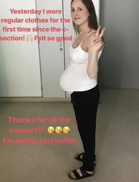 “Ho ancora una strana pancia cascante e sono un po’ sorpresa che non sia diventata più piccola dalla mia ultima foto 3 settimane fa. Sono un po’ delusa, devo confessarlo e non sono troppo felice di condividere questa foto. Un aspetto positivo però è ce la ferita da parto cesareo non fa più male e negli ultimi 2 giorni mi sono quasi sentita di nuovo me stessa.