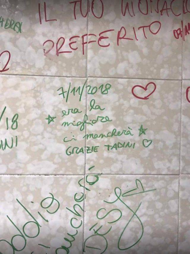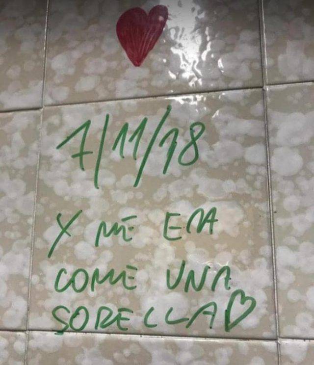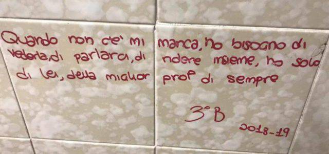 I ragazzi della sua scuola però hanno fatto anche di più. Hanno tappezzato di scritte, in ricordo della docente, i muri dei bagni.