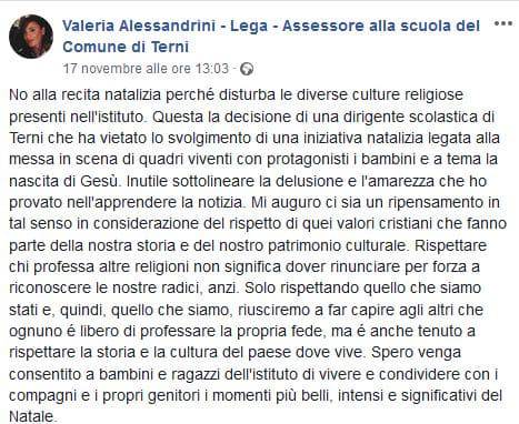 La denuncia è arrivata dall’assessore alla scuola del Comune di Terni, Valeria Alessandrini, della Lega: “No alla recita natalizia perché disturba le diverse culture religiose presenti nell’istituto“. L’assessora scrive che questa decisione è stata presa da una dirigente scolastica di una scuola primaria di Terni, in merito ad una recita natalizia con la messa in scena di “quadri viventi”, con protagonisti bambini, sulla nascita di Gesù.