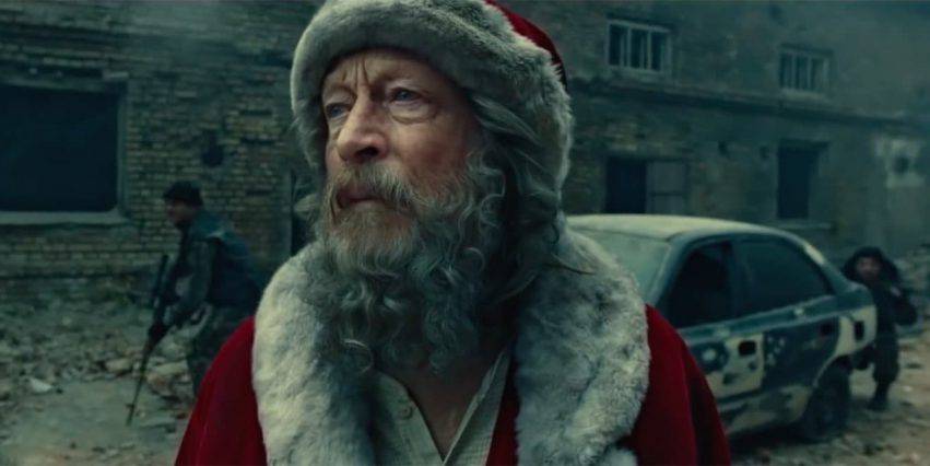 Babbo Natale cammina per le vie della città distrutta e viene sfiorato dai combattimenti, solo per fortuna non viene raggiunto dai proiettili. Bombe e spari però non lo fermano, entra in un grande edificio, dal quale le persone scappano e dopo aver attraversato corridoi e stanze con gli arredi in pezzi e le pareti sventrate, raggiunge uno stanzone, dove una bambina spaventata e seduta per terra, sopra un tappeto e qualche cuscino.