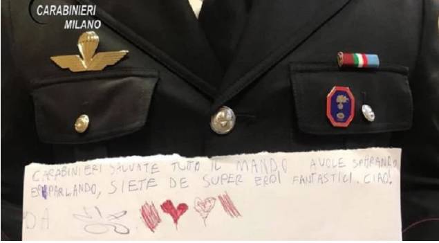 “Carabinieri salvate tutto il mondo a volte sparando e /o parlando. Siete dei supereroi fantastici grazie“ ha scritto questo bambino, aggiungendo dei cuoricini. Un dono sicuramente gradito che i carabinieri esporranno con orgoglio.