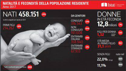 Secondo i dati Istat, nel 2017 sono stati iscritti all’ anagrafe per nascita 458.151 bambini, più di 15 mila in meno rispetto al 2016. Dal 2014 al 2017 le nascite sono diminuite di circa 45 mila unità e sono quasi 120 mila in meno rispetto al 2008. Questa differenza di nascite è dovuta in parte ad una diminuzione della popolazione femminile tra i 15 ed i 49 anni (circa 900 mila donne in meno) ed in parte ai sempre più bassi livelli di fecondità. Il numero medio di figli per ogni donna continua a scendere toccando l’1,32 contro l’1,45 del 2010.