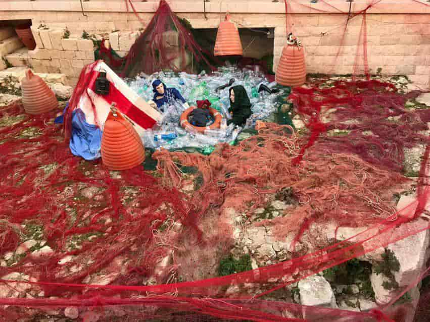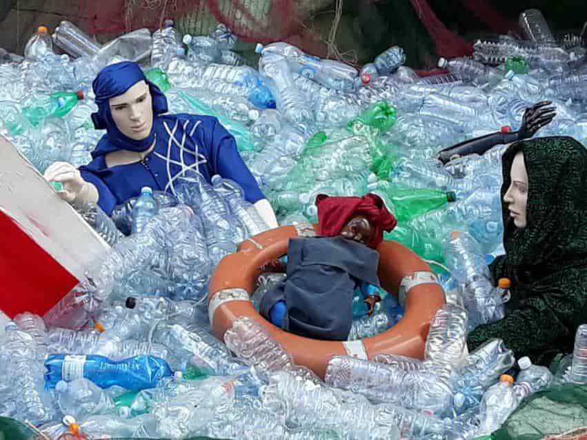 Una scena che non ha lasciato indifferente una fetta di popolazione e non solo locale, quella del “salvataggio” in mare, perché è proprio quello che ha voluto rappresentare l’immagine della natività della città in provincia di Bari. Nessun bue e nessun asinello a riscaldare Gesù, ma un braccio di un migrante nero che esce dal mare di plastica come richiesta di aiuto con intorno rifiuti, reti, boe di salvataggio sparse.