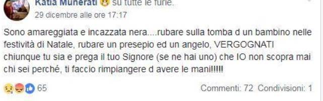 “È dal Natale 2007 che portiamo un segno del nostro amore e affetto per un bimbo diventato angelo, e nessuno ha mai trafugato nulla dalla sua tomba, ma quest’anno ho avuto l’amara sorpresa proprio nel giorno di Natale. Rubare è un atto indegno, ma rubare sulla tomba di un bimbo è imperdonabile. È il gesto più vergognoso che un essere umano possa commettere, ancora di più se commesso sulla tomba di un bimbo”.