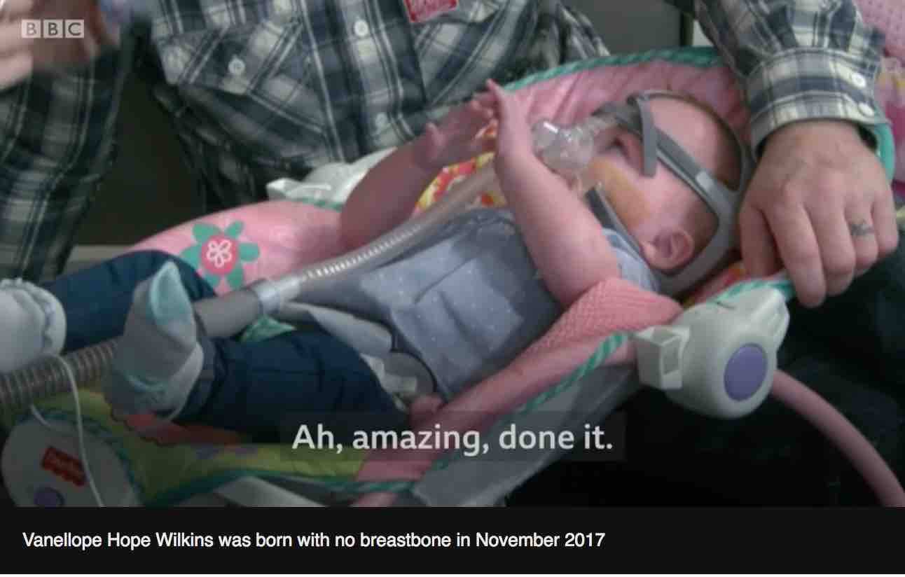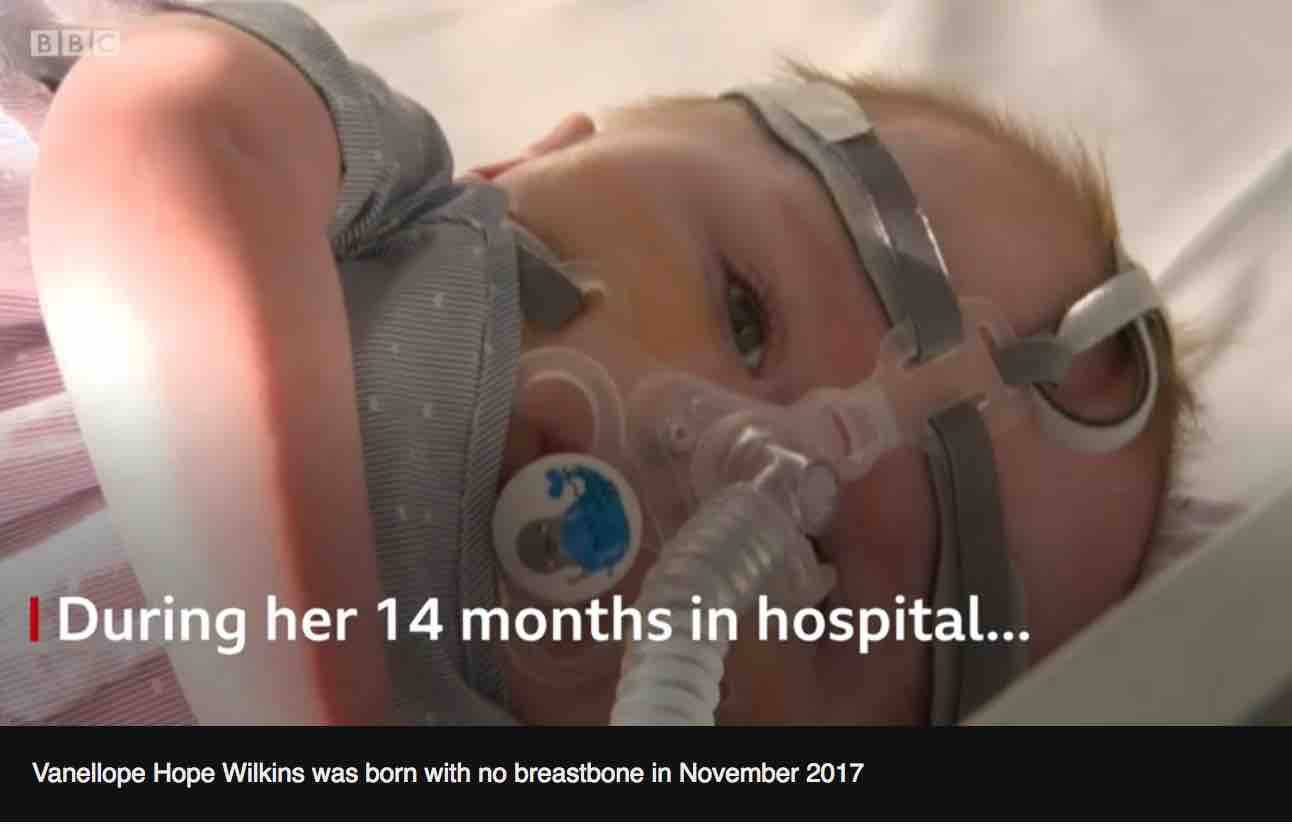 Vanellope Hope Wilkins è una vera, piccola guerriera, è stata la prima bimba a nascere in Uk con una rara malattia che le ha fatto crescere il cuore fuori dal petto e a sopravvivere.
