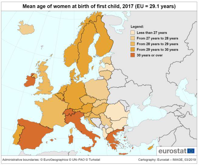 Nel 2017, l’età media europea del primo figlio è di 29,1 anni. Età che è aumentata nel corso degli anni, nel 2013 era di 28,7 anni.