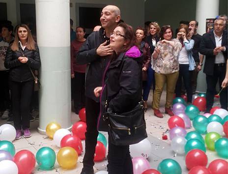 Appena Muharrem Poyrazoğlu è entrato nell’edificio, gli studenti hanno lanciato palloncini e coriandoli, poi hanno intonato alcuni cori, battendo le mani e si sono presentati davanti all’insegnante con uno striscione di benvenuto.