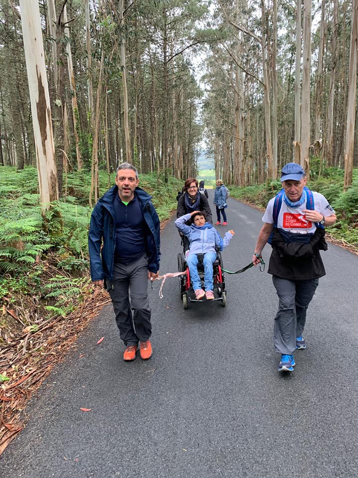 Caterina ha una carrozzina speciale, che le permette di correre, anche su sterrato. Angelica ha raccontato: “Perché siamo venuti a Santiago? Nel 2005 eravamo a Capalbio in vacanza. Ci hanno regalato una spilla-conchiglia con l’immagine del cammino. Era l’augurio di farlo anche noi. Siamo un piccolo gruppo di amici che aveva voglia di stare insieme, è stato naturale trovarci tra adulti e ragazze”.