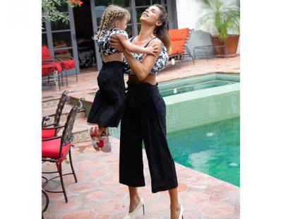 L’ex velina e showgirl italiana, Elisabetta Canalis e la figlia Skyler Eva hanno lo stesso look: pantalone cropped nero su top corto del brand Monnalisa. La differenza è nelle scarpe: tacchi per la mamma e sandali bassi per la piccola.