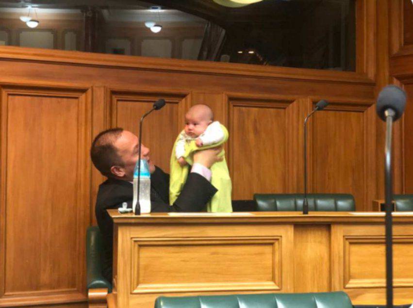 Il bimbo è il primo piccolo a salire sullo scranno del presidente insieme, appunto, a Trevor Mallard, è stato poi allattato con un biberon.