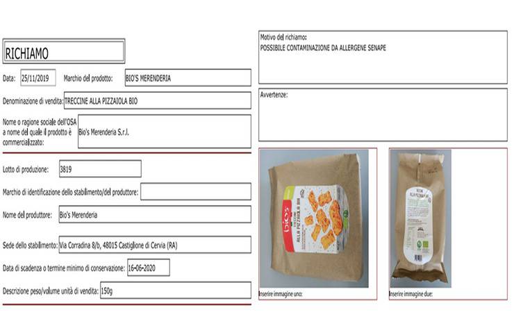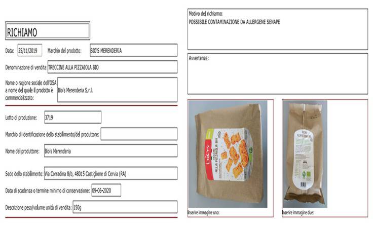Ad essere oggetto di richiamo sono le Treccine alla Pizzaiola Bio confezionate in porzioni da 150 grammi. Il motivo del richiamo è la contaminazione da allergene, in questo caso la senape. Il richiamo è stato reso noto oggi, 26 novembre. I lotti incriminati sono due: