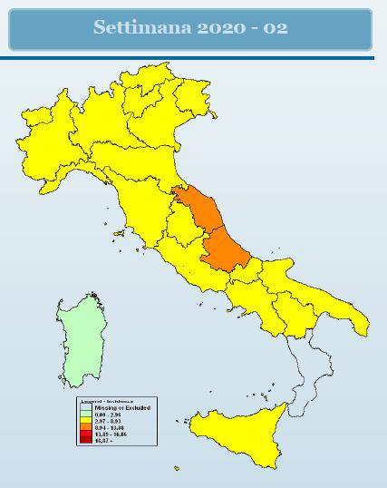 Le Regioni italiane più colpite dal virus dell’influenza in questa seconda settimana dell’anno sono: Piemonte (6,53 casi su mille assistiti), Lombardia (6,76 casi), Liguria (6,51 casi), Umbria (6,81 casi), Marche (9,33 casi), Lazio (7,22), Abruzzo (9,43 casi), Campania (7,49 casi) e Sicilia (6,69 casi).