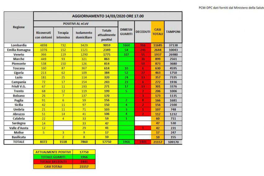Il bollettino aggiornato, annunciato nella consueta conferenza stampa della Protezione Civile alle 18.00, riporta per sabato 14 marzo: