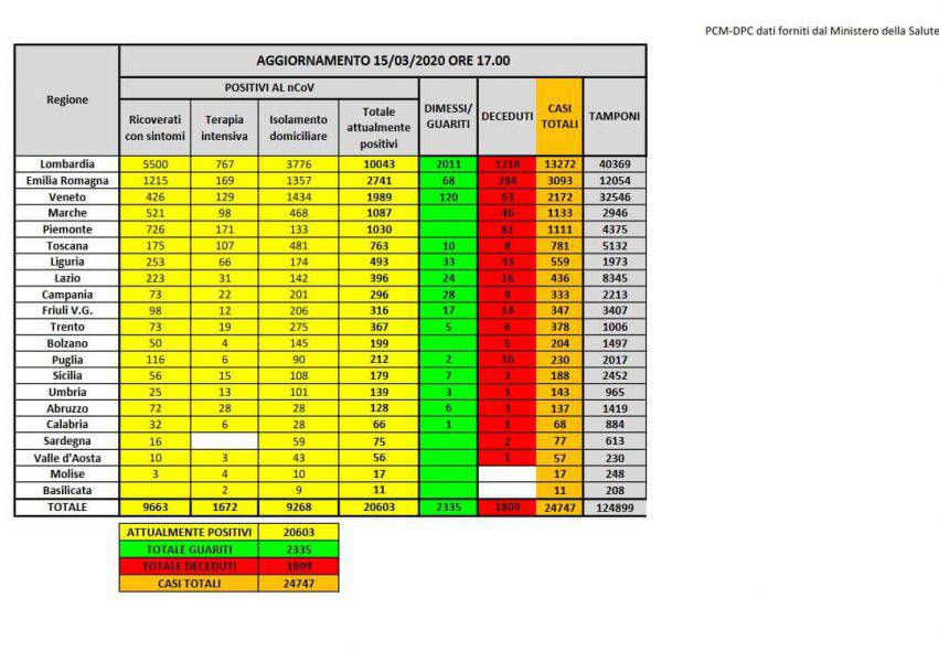 Puntualmente alle 18.00 anche oggi, domenica 15 marzo, la Protezione Civile ha comunicato i dati aggiornati sull’epidemia di Coronavirus in Italia. La malattia Covid-19 (provocata dal nuovo Coronavirus, il nome scientifico è Sars-Cov-2) sta continuando a colpire duramente il nostro Paese, con un costante aumento di casi giornalieri. I dati del bollettino segnalano 20.603 persone attualmente positive al Covid-19 in Italia, che dall’inizio dell’epidemia fanno 24.747 (numero che include anche i guariti e i deceduti), quasi 25mila complessivi, con un aumento 3.590 di casi totali.