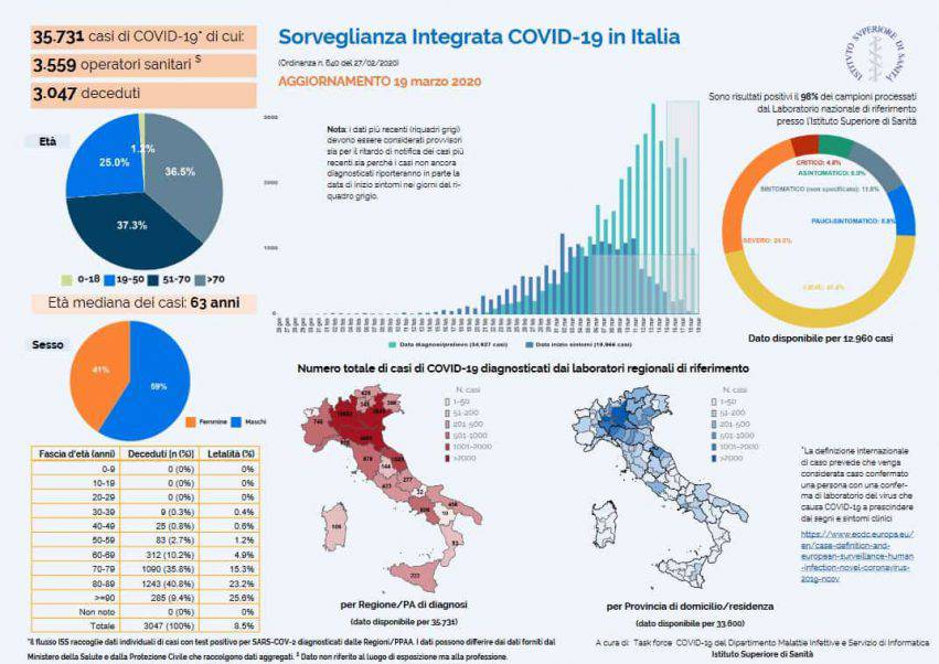 I dati della sorveglianza integrata Covid-19 in Italia dell’Istituto Superiore di Sanità, aggiornati al 19 marzo 2020.