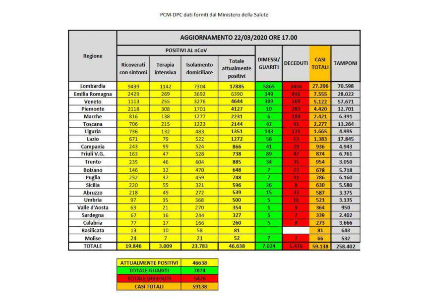 Nella giornata di domenica 22 marzo si registrano 3.957 nuovi positivi al Coronavirus, per un totale di 46.638 persone attualmente positive, che fanno 59.138 casi complessivi dall’inizio dell’epidemia. I decessi complessivi sono 5.476, con un incremento giornaliero di 651 vittime (un numero ancora elevato ma inferiore a quello di ieri quando è stato di 793 decessi). Mentre le persone guarite in totale sono 7.024, più 952 da ieri.